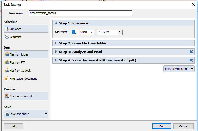 We use Abbyy FineReader to create OCR PDFs from image files. Abbyy Hot Folder is included in Abbyy FineReader and is used to schedule “tasks” for PDF creation.