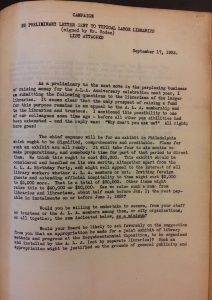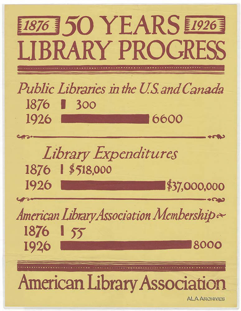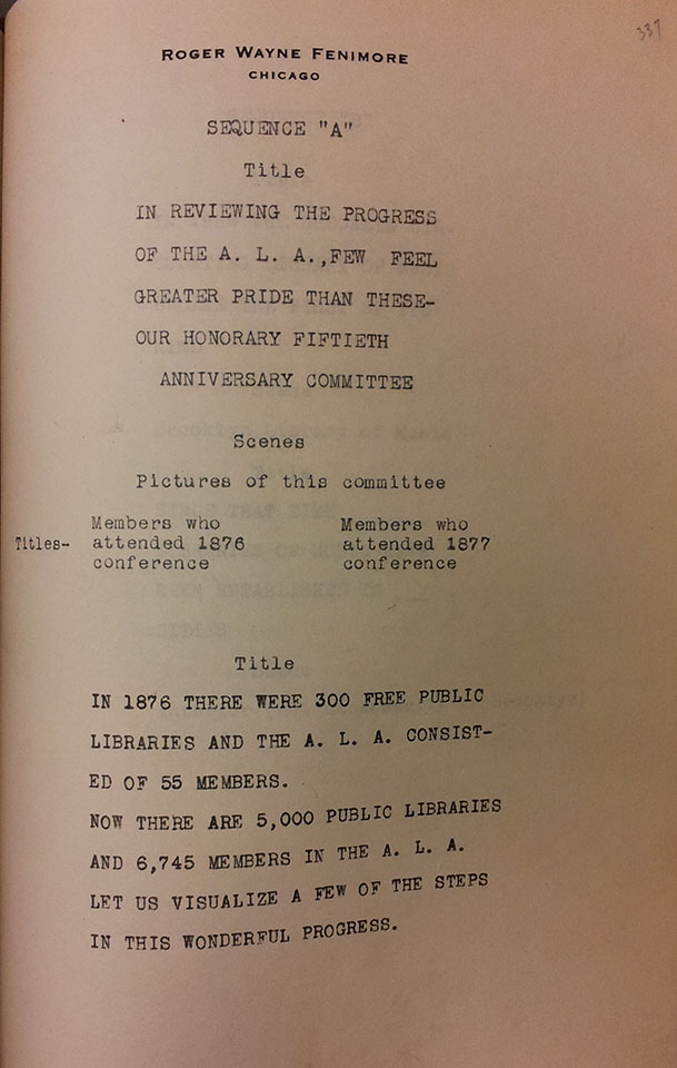 The Fiftieth Anniversary Committee met seven times, during a three year period, during each Mid-Winter and Annual conference, to plan the celebration. [1] The first meeting explored ALA officer and member submitted suggestions for celebrating. [2] One suggestion included hosting an international library conference including paying expenses for official delegates of foreign governments. Another submission suggested a local exposition or a traveling exhibit on the importance of libraries. While another submission suggested the production of a publication similar to the 1876 “Public Libraries in the United States”. The second meeting confirmed those three suggestions and Chairman Roden stated that $100,000 could be needed to finance the celebration. The third meeting appointed three sub-committees: Conference, Exposition, and Publications. The fourth meeting finalized the scope specific proposals. The fifth meeting reduced proposals based on financial limitations. [3] The sixth meeting appointed a Committee on Ways and Means to coordinate funding the Conference. The seventh meeting concluded that $30,000 was raised and individual member reactions to the Committee’s request of funding were reported. Among the cancelled proposals was an educational film about librarianship and the ALA.