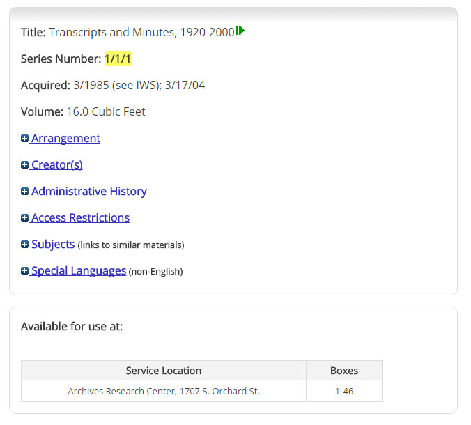 The first sentence provides the title in reverse. In the example, we read “Transcripts and minutes of ALA Council Meetings” instead of “ALA Council Meeting Transcripts and Minutes”. Next, a brief list of the categories of document types is included. In this case, we see “reports and supporting documents”. Sometimes, by not limited to, record series can include: audiovisual materials, blueprints, correspondence, departmental reports, drawings, or photographs.