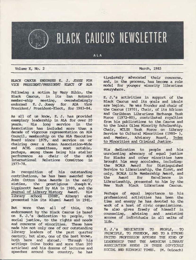 E. J. Josey was A.L.A. President (1984-85) and Black Caucus Chair (1970-71). A.L.A. offices would have documents received from him. After retiring, Mr. Josey could donate his presidential papers to A.L.A. Archives as a single Record Series. However, administrative Black Caucus documents were kept by the Black Caucus because they still needed those active records. At a later date, Black Caucus would donate their records which include some items written or co-written by Mr. Josey.