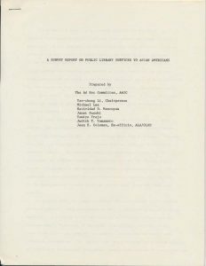 [1] A copy of this report was published too. Please see: Asian American Librarians Caucus. “A Survey Report of Public Library Services to Asian Americans”. Journal of Library and Information Science 3 (October 1977):182.