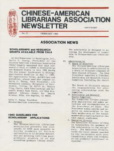Research Tip: Newsletters provide a wealth of general interest articles about current events which include publications or people of interest to readers. Researchers should be sure to review CALA Newsletters for additional information about Chinese American and other Asian American historical events and people. Often, professional newsletters can include biographical information on many members. Sometimes obituaries are written for prominent members too. (For biographers, historians, genealogists, and other researchers, biographies in professional publications have been identified as the only source of information about a person’s life.) Also, Newsletters has been home to editorials about librarianship, society, and politics. For organizations like the CALA, Newsletter and other publications are rich with information for all.