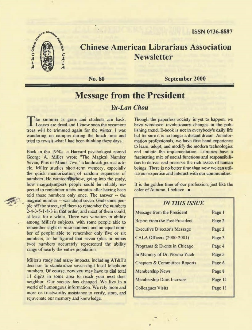 Since the 1970s, Membership Directories and Newsletters of the Chinese-American Librarians Association (CALA) and Asian Pacific American Librarians Association (APALA) have provided information resources for Asian American and Pacific American professionals working in libraries. Here at the A.L.A. Archives, we want to tell you all about our holdings which are information rich for current and future readers.