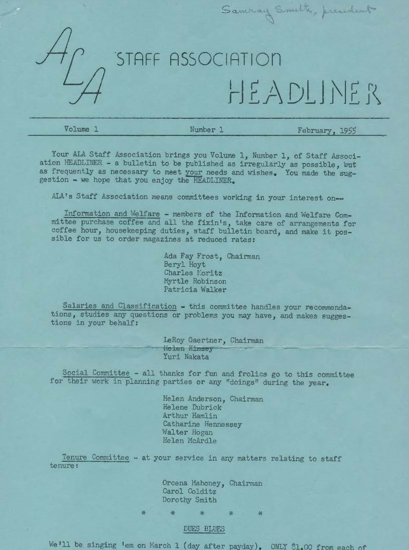 From mid-October 1951 to 1972, the blue and black ink on white paper A.L.A. Headquarters Reporter began as a “memo to the ALA Executive Board and Headquarters Staff”. While from 1955 to 1958, the A.L.A. Staff Association produced the Headliner on blue, green, yellow, and pink paper. For 1955 and 1957, the issues were printed on legal-size paper and the 1957 issues include sketches related to adjacent articles.