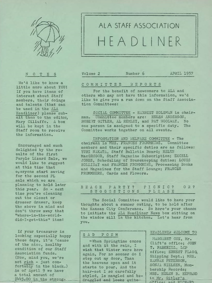 When some researchers want to know about life at the A.L.A. Headquarters, then I recommend reading the Headquarters Staff Association Files (Record Series 2/4/80) and Headquarters Newsletters, (Record Series 2/4/10). In particular, like other previously highlighted publications, there is much creative expression and good will to be found at the A.L.A. and in the archives.