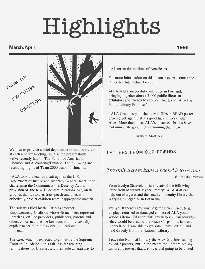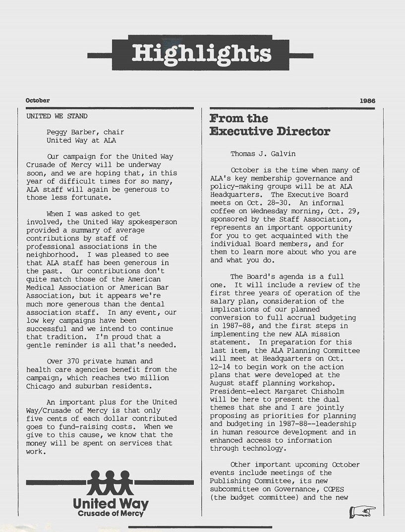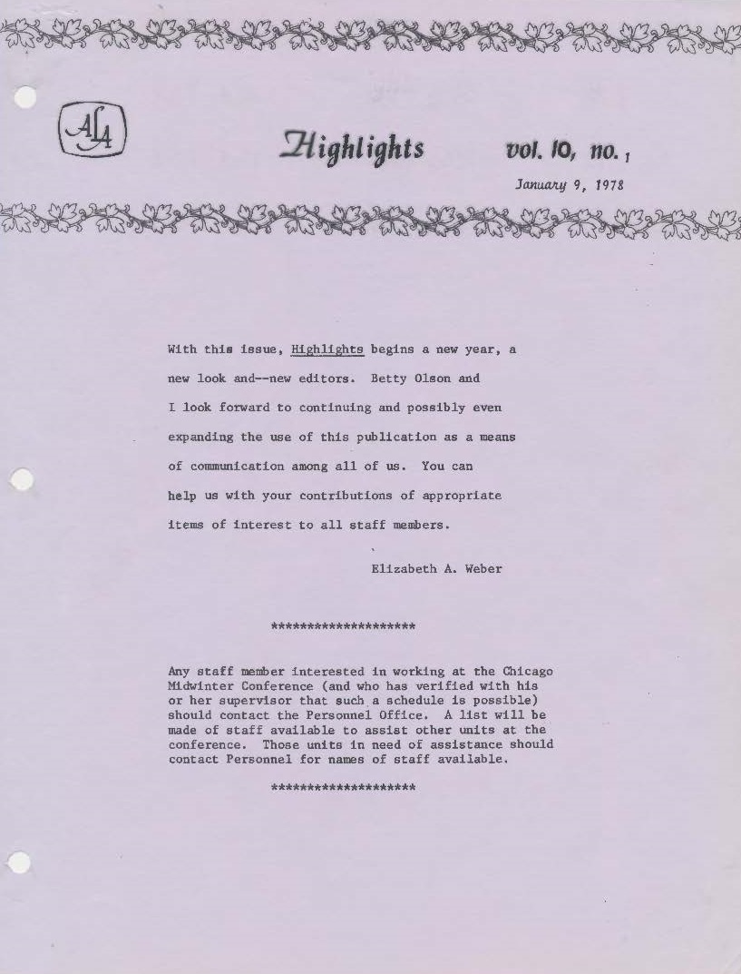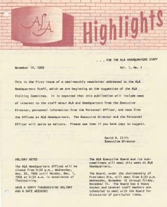 Meanwhile, since 1969, Highlights … For the ALA Headquarters Staff was released featuring the Executive Director and Personnel Officer as editors. From 1969 to 1971, the publication featured a formal masthead printed in red ink on white paper. In 1972, the publication returned to the original style–black ink on colored sheets. By the 1980s, the publication was printed in a two-column news format with a new masthead too.