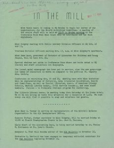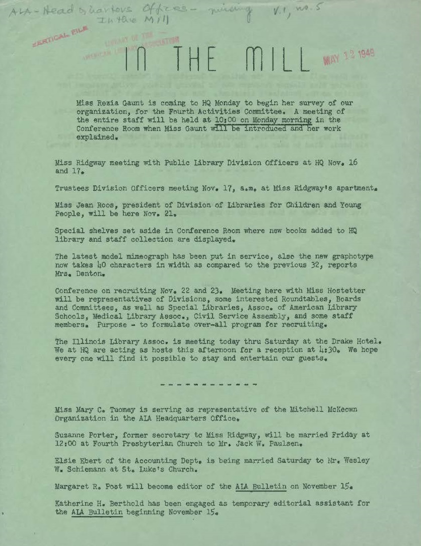 Since at least 1947, there have been multiple publications produced by or with Headquarters Staff. From 1947 to 1948, headquarters staff read a two-sided, green bulletin titled In the Mill. This publication featured meeting, office, and personal announcements. From 1948 to 1951, edited by A.L.A. Executive Secretary John Mackenzie Cory, the ALA Bull continued the green sheet style and reporting until Mr. Cory’s departure to New York Public Library.