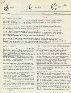 For the first five years of the Newsletter‘s existence, the publication expanded from stating the Jewish Caucus’s purposes, as seen in the first issue (above), to a growing publication with regular features including bibliographies, news on international Jewish librarians and libraries, essays about Jewish librarianship, book reviews, and rich debates on issues impacting Jewish librarianship. The first volume includes a hand-drawn masthead, prominently featuring the then affiliated organization’s acronym. The second volume’s masthead, also featuring the new title Jewish Librarians Caucus Newsletter, experimented with sans serif letterforms and hand drawn logos featuring either a dreidel (see: Volume 2, Number 1) or a scale of justice (see above: Volume 2, Number 2). From 1977 through 1980, the Newsletter was produced under editor Cookie Lewis-Soldinger.