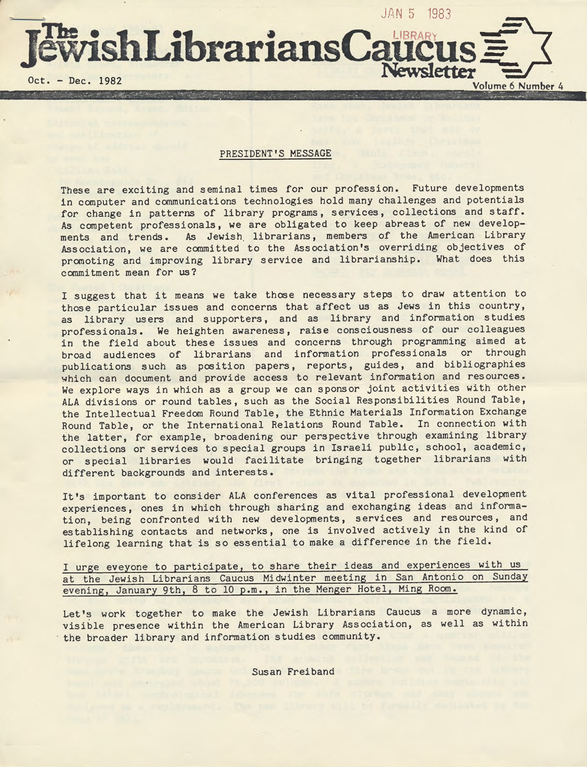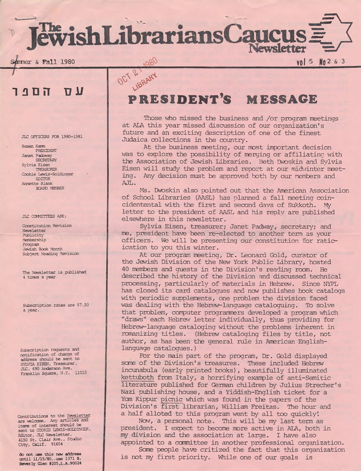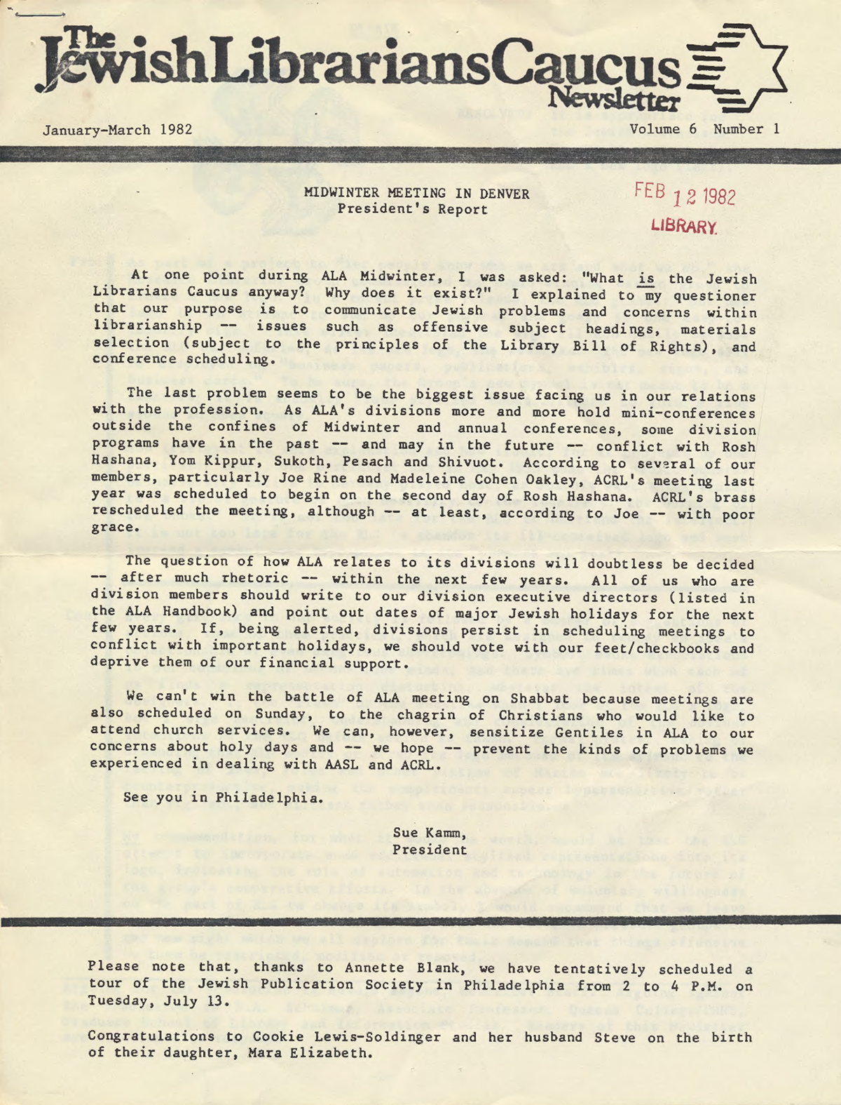 During the late 1970s, the cover of The Jewish Librarians Caucus Newsletter alternated from caucus and conference reports to presidential messages. Presidential messages highlighted significant Jewish librarian concerns, including the challenges of organizing conference and convention events which did not conflict with Jewish (as well as Samaritan and some Christian) attendees who followed Shabbos (also Shabbat or Sabbath) and refrain from work activities on the seventh day of the week.