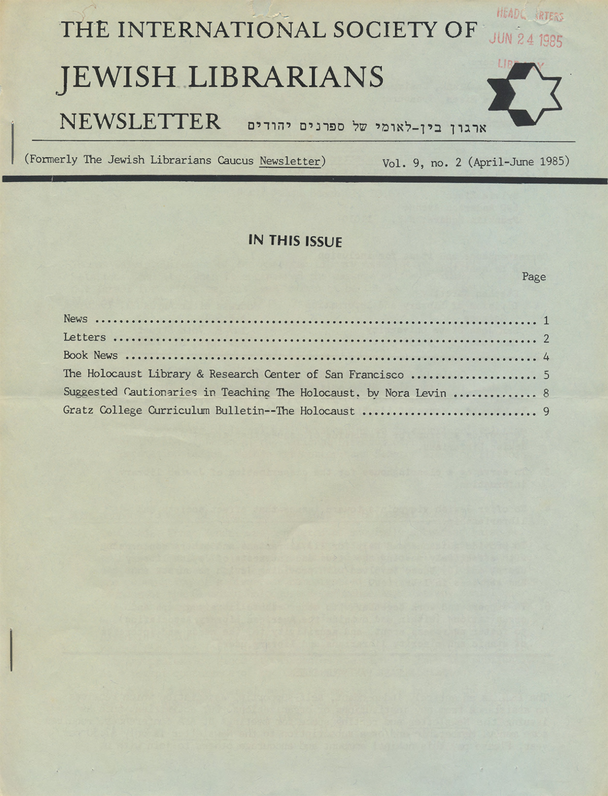 By 1985, Stephen Karetzky was the editor, and the publication changed names to The International Society of Jewish Librarians Newsletter. At the same time, Susan Freiband stepped down to succeed David Cohen as the new head of the Ethnic Materials Information Exchange Round Table (Record Group 56), and Annette Blank was the new ISJL chair. The new layout featured the table of contents on the cover, while publication included an increase in reproductions of articles from other Jewish publications on global issues impacting Jewish librarians and their communities.