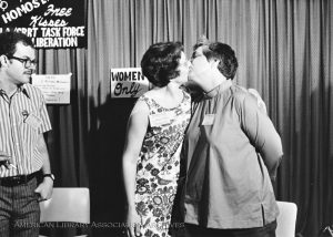 Another highlight of the Gay Task Force’s early history is their efforts to combat job discrimination for gay librarians. In 1970, Michael McConnell was offered a job at the University of Minnesota Libraries, but his appointment was rejected by the Board of Regents after McConnell applied for a marriage license with his partner, Jack Baker. McConnell contested the rejection of his appointment, and spoke about his experiences at the 1971 Annual Conference. At this meeting the ALA Council also approved a resolution condemning discrimination again non-heterosexual library users and employees. The 1971 Annual Conference also played host to the Gay Task Force’s “Hug a Homosexual” kissing booth, which aimed to cause a scene and gain publicity for the newly formed Task Force.