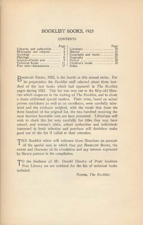 For 22 years and often published in March, The Booklist Books series (Record Series 13/3/12) provided guidance for U.S. librarians seeking assistance with selecting the right books for their library communities. Not to be confused with the annual New York State Library Best Books series, the A.L.A.’s The Booklist Books was compiled from the A.L.A.’s monthly Booklist (Record Series 13/3/4). But, the The Booklist Books staff did not always work alone. Over time, a variety of librarians had contributed specialty lists too. In fact, from 1919 until 1933, Pratt Institute Free Library Head of Applied Science Reference Department Donald Hendry alone contributed the Technical Books section. For the publication’s first 4 years, the book list was organized into 4 sections, including general literature, fiction, children’s books, and technical books, followed by an alphabetical author and title index too. In 1921, the series was retitled Booklist Books, and in 2 years it would undergo another formatting change.