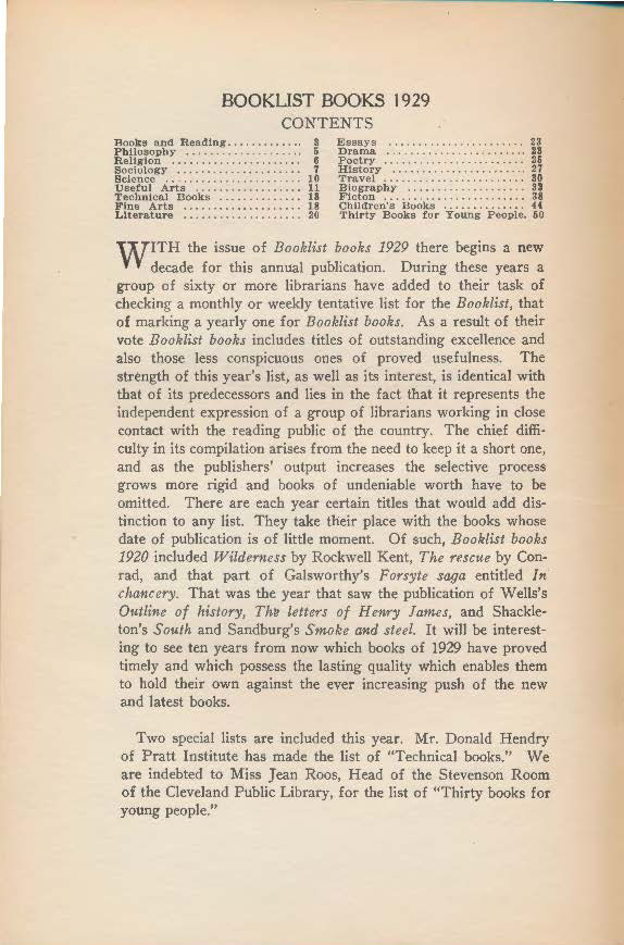 During the 1920s, more guest contributions would follow. In 1928, A.L.A. Committee on Hospitals Chair Miss Perrie Jones contributed the list “Hospital Libraries”. In 1929, Cleveland Public Library Stevenson Room Head Miss Jean Roos contributed “Thirty Books for Young People”.
