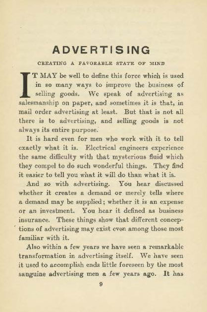 In Advertising, by advertising executive Earnest Elmo Calkins, the author describes the advertising profession and he recommends 6 books for further reading. While in Salesmanship, by salesmanship writer John Alford Stevenson, the author describes the salesmanship profession and he recommends 6 books for further reading too.
