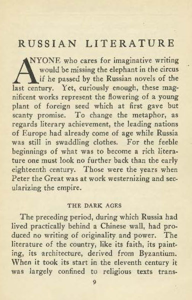 In Russian Literature, by anthologist, critic, and scholar of Russian literature and New York Public Library Slavonic Division Chief Avrahm Yarmolinsky, the author describes the history of Russian literature while recommending 6 books for further reading. While in Farm Life, by author and editor Clarence Poe, the author describes contemporary agricultural economic concerns for both rural and urban audiences, before recommending 8 publications for further reading too.
