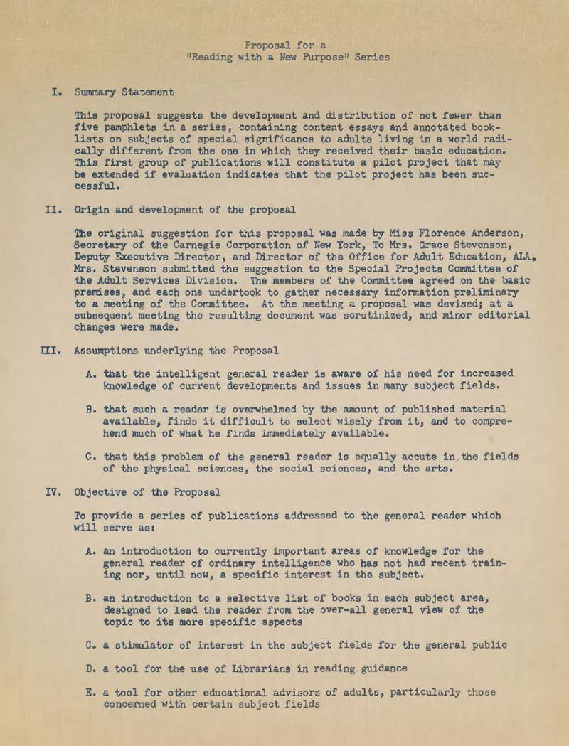 Following the success of Reading with a Purpose (Record Series 29/3/10), it was in 1960, when the Adult Services Division Special Projects Committee proposed a new series, later known as Reading for an Age of Change. The original proposal (for the tentatively titled Reading with a New Purpose) was for a 5 pamphlet project, with the option to extend the series at a later date. According to the original proposal, Carnegie Corporation Secretary Miss Florence Anderson first suggested this proposal to A.L.A. Office of Adult Education Director Mrs. Grace Stevenson–who would later successfully lead the project.