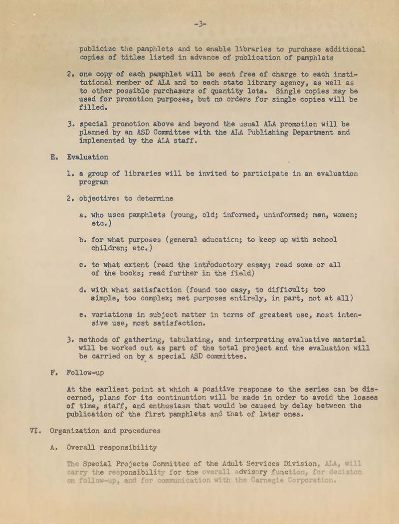 From the second document, the project plan, readers learn about the concrete details of what would become Reading for an Age of Change. The ASD Special Projects Committee advised the project and communicated with the Carnegie Corporation too. [1] A Reading Guide Promotion Committee was tasked with promoting the series. [2] More information about the Reading Guide Committee can be found in the Adult Services Division Special Projects File (Record Series 30/2/6).