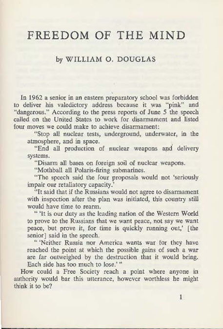 In Freedom of the Mind, by Associate Justice of the U.S. Supreme Court William O. Douglas, the author writes a 37-page introductory essay to the importance of freedom of speech, before recommending 12 titles for further reading in an additional essay.