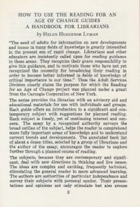 [2] The Reading Guide Promotion Committee included Chair Sarah L. Wallace, Wilmer V. Bell, Elbert W. Burr, Sheila A. Egoff, Hoyt R. Galvin, Alice Norton, Wilson Thiede, and Patricia B. Knapp.
