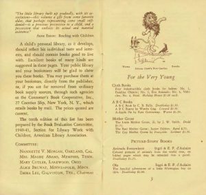 In 1935, as the Section for Library Work with Children continued to grow, the committee had become a subcommittee of three librarians within the expanding Book Evaluation Committee. This edition also featured further subdivision into four sections including, “Picture Books”, “To Read to Little Children”, and both Books for Boys and Girls “From 9 to 11 Years Old” as well as “From 12 to 15 Years Old”.