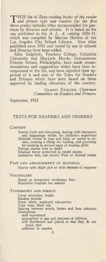 In 1933, chaired by Los Angeles Public Library Directory of Work with Children Gladys English, the new publication expanded on Los Angeles City School Librarian Marion Horton‘s list found in the 1926-1931 A.LA. Catalog (Record Series 13/15/12). This new 1933 publication featured 2 different lists. The first list Easy Reading Books included 22 titles, and the second list Readers for the First Three Grades included 15 titles. Following the introduction, this publication also featured criteria for evaluating book titles for recommendation.