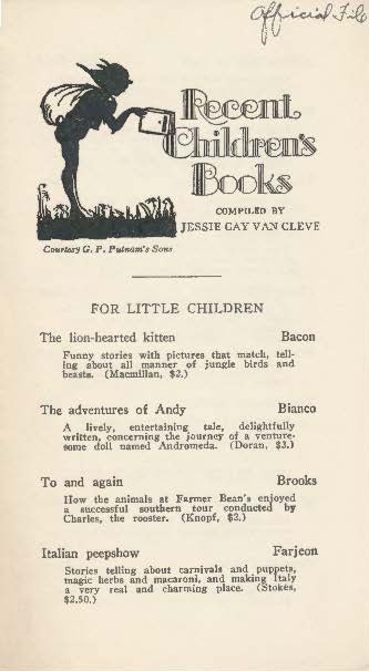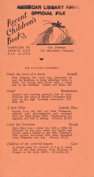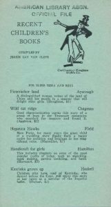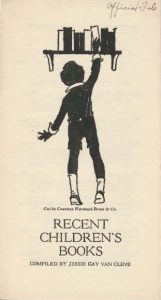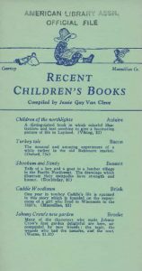 At least as early as 1925, the earliest publications of Recent Children’s Books were four-page documents recommending recent children’s book publications from the previous year until present. Over time, the list would grow and so too would the bibliographies. In 1925, there were two sections, including “For Very Little Children” (as seen in the first image above) and “For Older Girls and Boys”. In 1926, a cover image was included featuring a cut courtesy of the Harcourt Brace and Company, with new ALA Headquarters member Jessie Gay Van Cleve credited as the compiler. In fact, for almost the entirety of the series, beginning with this edition, children’s book publishers took annual turns providing courtesy images for the bibliography’s cover. The 1926 edition also included six pages of recommendations too. The following year, in 1927, the content was reduced to four pages, “For Older Girls and Boys” was changed to “For Older Boys and Girls”, and a new cut was on the cover too. While the 1928 edition also featured a new image and four new pages of books too.