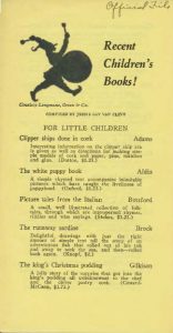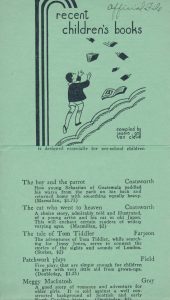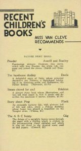 In 1933, the organization changed again with two new sections too, including “Picture Story Books” and “For Readers Eight and Over”. In 1934, the sections were replaced with “For Younger Children” and “For Older Boys and Girls”. In 1935, the publication began printing with ink colors other than black, a publication price guide was included at the bottom of the last page, and the books were arranged alphabetically by the author’s last name rather than by reading level. In 1936, the section titles were removed, a new catalog by Mahony and Whitney, Five Years of Children’s Books, was recommended at the end, and an untitled and possibly abstract image was included on the cover.