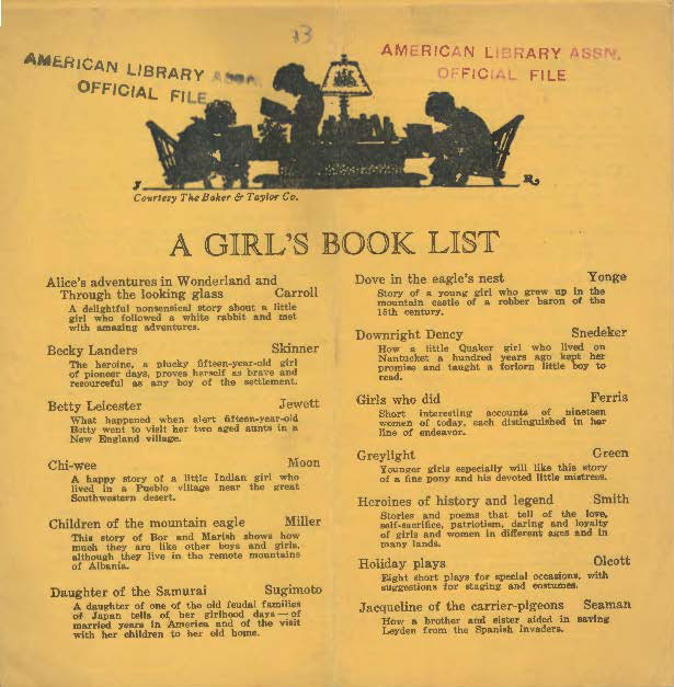 In 1925, A Boy’s Book List was published with at least two variant cover images and A Girl’s Book List was published too. Both publications feature images inspired by books from the list, and books are arranged alphabetically by title.
