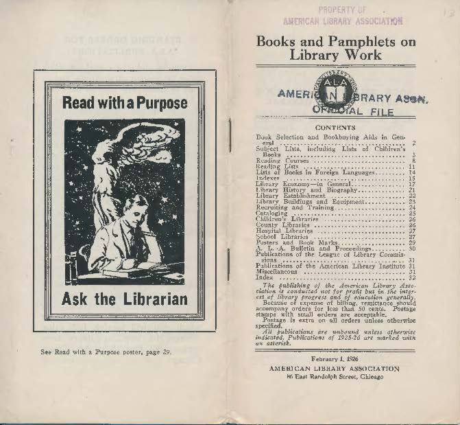 In 1921, a promotional postcard featuring a cartoon by Chicago Tribune cartoonist John T. McCutcheon includes a two-panel catalogue of publications about both library work and a copy of the poster as well as an order form too.