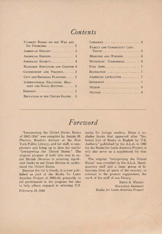 In 1944, the new supplement, Interpreting The United States, Books of 1942-1944, was released. As we read in the foreword, while initially intended for British public libraries, the list was also included in the Books for Latin America Project of 1943-44. Unlike its predecessor, the editorial staff was reduced from ALA Headquarters and nationwide librarians to Jennie Flexner (of New York Public Library) and colleagues. In the table of contents, we see the sections including: “Current Books on the War and its Problems”, “American History”, “American Regions”, “American Society”, “Economic Structure and Growth”, “Government and Politics”, “City and Regional Planning”, “International Relations”, “Military and Naval Matters”, “Religion”, “Education in the United States”, “Libraries”, “Family and Community Life: Youth”, “Medicine and Hygiene”, “Nutrition: Cookbooks”, “Fine Arts”, “Recreation”, “American Literature”, “Biography”, “Humor”, and “Fiction”.