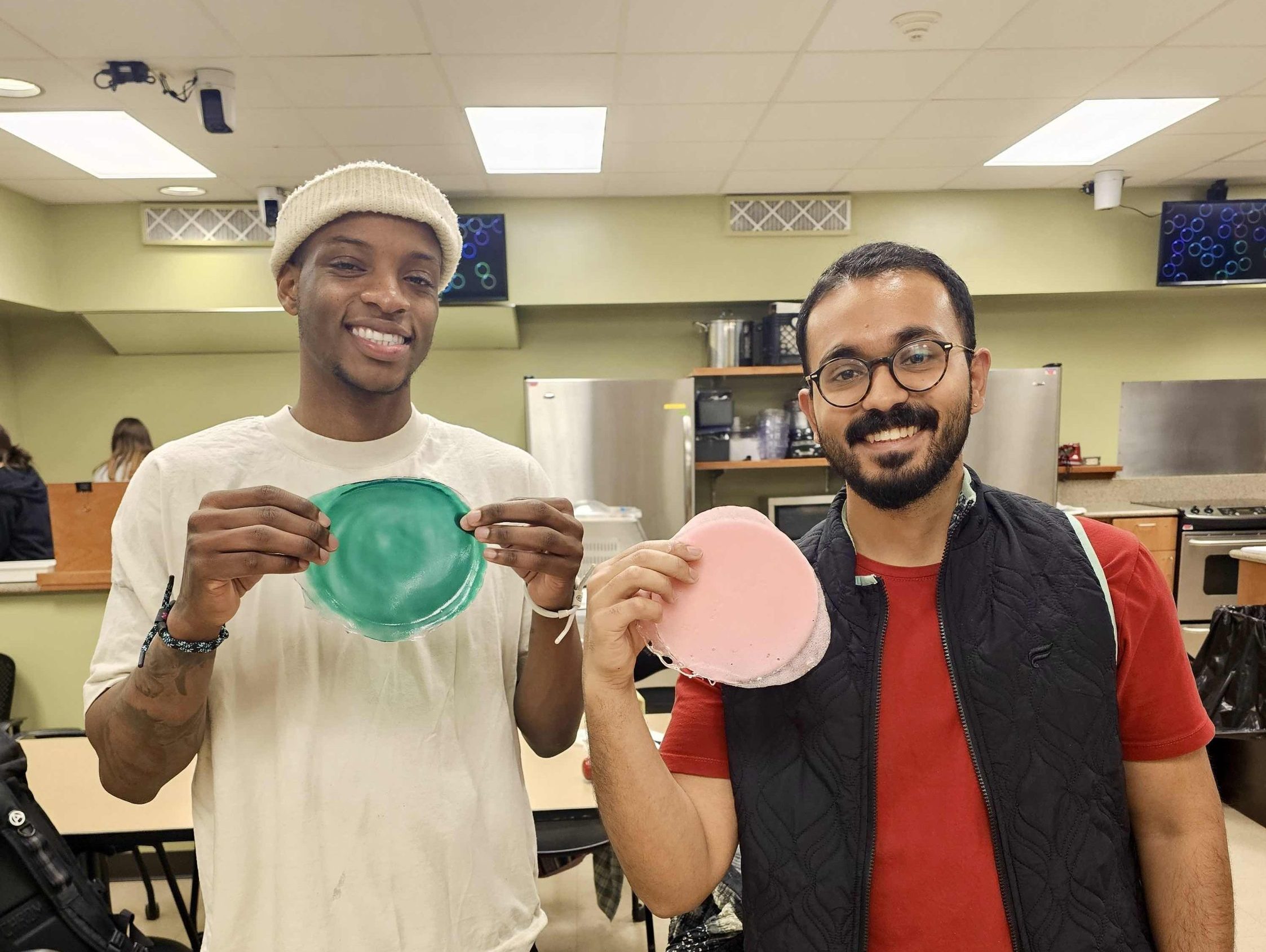 Two participants in the Bioplastics & Banana Leather workshop display their creations.