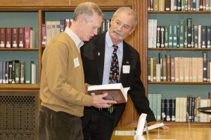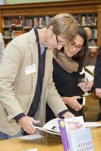 Surangi Punyasena holding a reprint of Alfred Russel Wallace’s Natural Selection and Tropical Nature, and Mark Taylor hoding Peter Land’s The Experimental Housing Project (PREVI), Lima