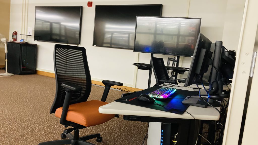 The Immersive Learning Lab is for large group (12-15 people) workshops, course labs, RSOs, campus eSports,equipped with high-end Alienware R12 Aurora workstations for development, gaming, VR-content, and an instructor station that casts to two 84” wall-mounted displays. Illini Esports and the VR Club at UIUC use this space for scrimmages and events.