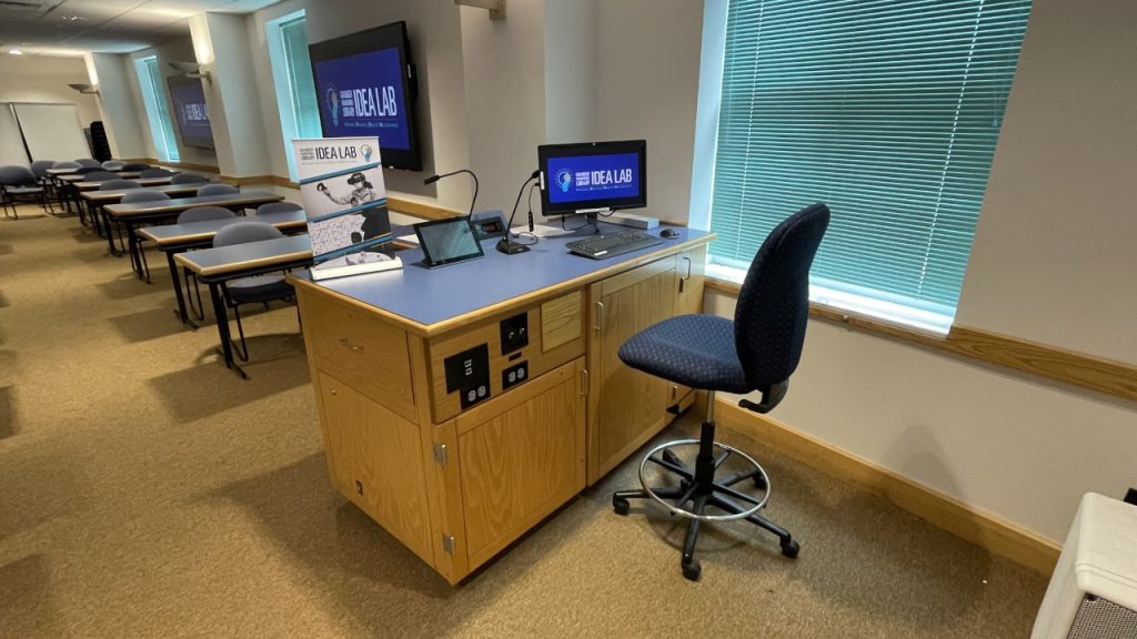 The IDEA Lab has ten Innovator Design Rooms (rooms 002-007). These small-group spaces have a capacity of 2-5 people, and a minimum of 2 people are required to reserve and use the space. Each room features one whiteboard and one table-mounted 42” display for mirroring one or more devices with a wireless connection. Reserve this space.
