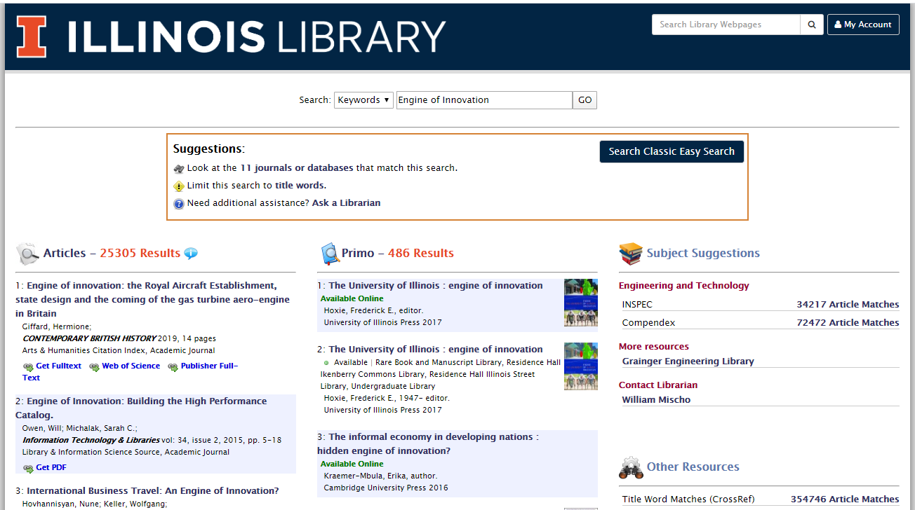Currently, the University Library’s primary discovery (searching) tool is called Easy Search (Easy Search Bento). This allows patrons to search a variety of sources for books, ebooks, media, articles, journals, subject databases, and websites, while simultaneously eliminating overlapping results. Easy Search will be integrated with the new Primo Library Catalog so that patrons can continue to search from a single search box on the Library’s homepage.