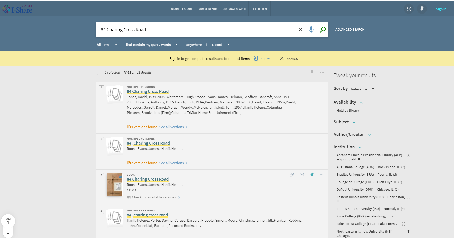 All I-Share Libraries Consortium Primo Catalog sample search: