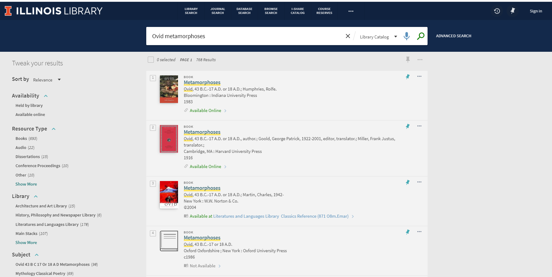 Primo Library Catalog sample search: