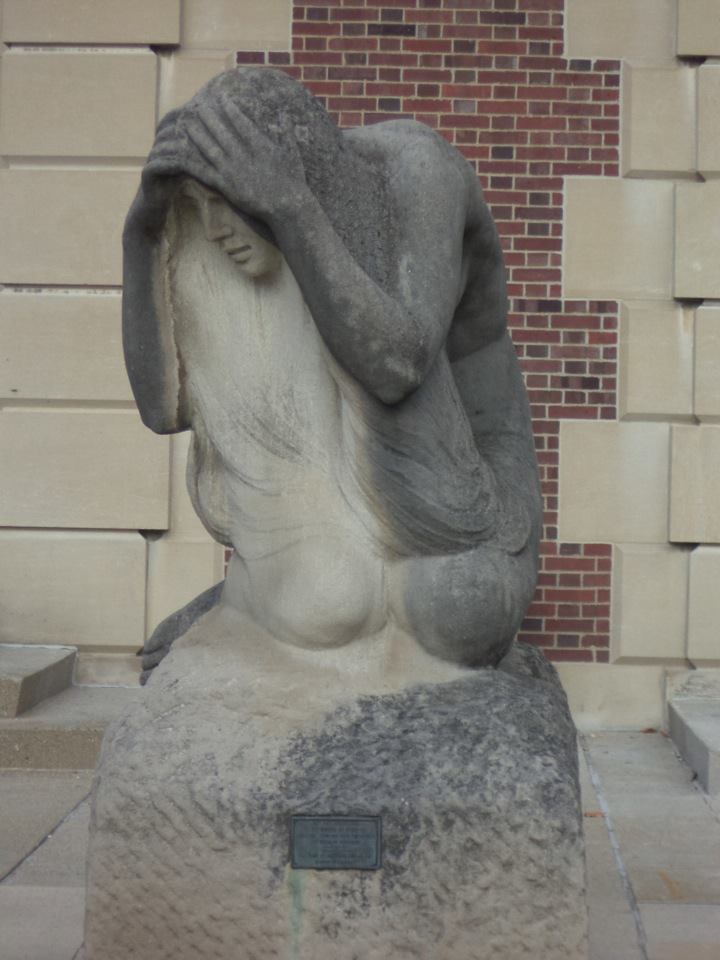 Daughter of Pyrrha sculpture by Lorado Taft in front of the east entrance to the Main Library