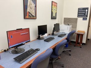 HPNL has wifi access as well as desktop library computers available for use. If you need to print a document, HPNL has a black and white printer. You can send print jobs from either your own laptop or the library computers. We cannot accept cash or credit card payment for printing so you will need to have Illini Cash set up to use our printers. If you need to view microfilm, HPNL has