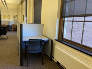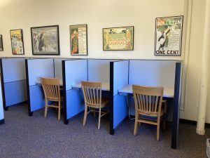 HPNL is a semi-quiet study space that has both large study tables that work for both individuals and small groups, as well as new individual study carrels! There is both traditional library seating as well as soft seating. The library has great natural lighting through large windows in the main reading room. If you need an even quieter space to read or study, and don’t mind a bit of cool temperatures, we also have a few seats in our microfilm stacks available for use.