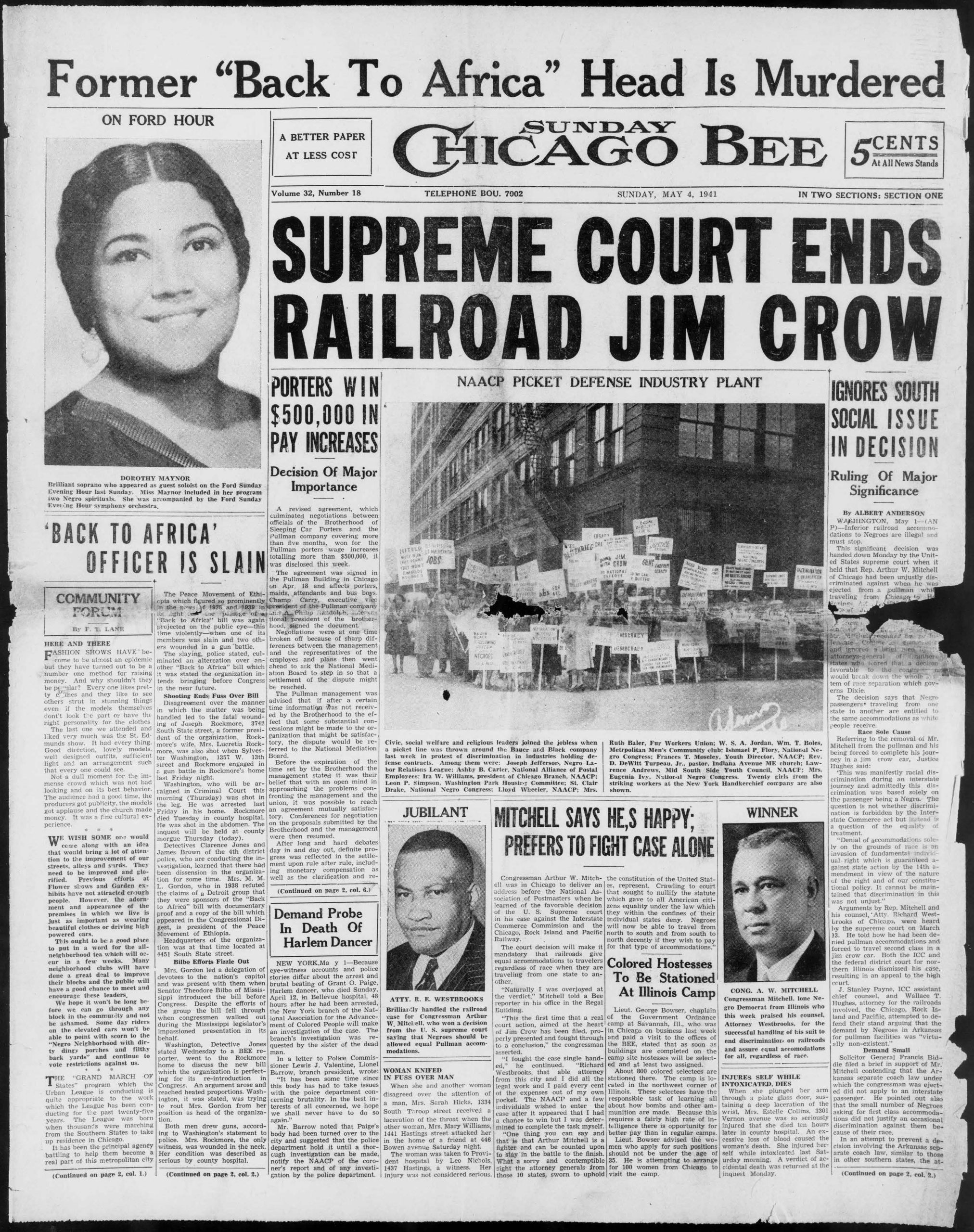 Moving on in my search, I found many articles about the Brotherhood of Sleeping Car Porters, given the Chicago locale of the Pullman Company and the rail system’s prominence in Chicago, Illinois. This front page of the May 4, 1941, issue of the Sunday Chicago Bee (Chicago, Ill.) announces the Supreme Court ending Jim Crow in the railroad industry. Other columns on the font page include a pay increase negotiated by the Brotherhood of Sleeping Car Porters and the Pullman Company, and an image of labor and civic leaders picketing “the Bauer and Black company in protest of discrimination in industries holding defense contracts.” Click the image to enlarge.