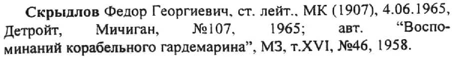 Using published sources and archival materials, this recent contribution to emigre studies covers 1890 Russian naval servicemen who died abroad. Entries are arranged alphabetically by surnames and provide full names, dates of birth and death, rank, place of death, and citations for the obituary. There are several appendices for unusual classes of servicemen such as a list of those who died on the cruiser “Leitenant Dydymov.” A list of sources and a dictionary defining a number of terms and organizations round out the book. See the entry for Fedor Georgievich Skrydlov who died in Detroit, Michigan.