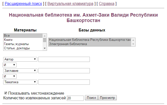 The National Library of the Republic of Bashkortostan, named after Akhmet-Zaki Validi, was established in 1836. The library currently has over 3.3 million items. The library’s electronic catalog (Elektronnyi katalog) provides a way for users to obtain bibliographic information about the holdings at the national library. There is no period of coverage given for this catalog, but its contents are assumed to reflect the holdings at the National Library. Users may search by material type, author, title, theme, year of publication, and location of publisher. There is also a virtual keyboard to type in Bashkir. The advanced search interface is shown in the image below.