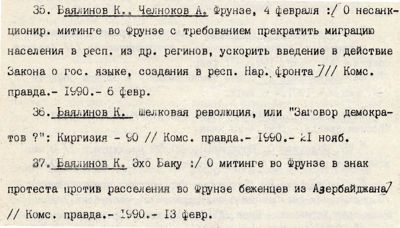 Published since 1965, this resource indexes works in all formats (books, journal and newspaper articles, avtoreferaty of dissertations, reviews, pictorial art publications, etc.) pertaining to Kyrgyzstan but published outside its borders. It has appeared under various titles ( Respublika Kyrgyzstan v pechati SSSR i zarubezhnykh stran/Kyrgyz Respublikasy SSSRdin zhana chet ȯ lkȯ lȯ rdu̇n basma sȯzu̇ndȯ and Kirgizskaia SSR v periodicheskoi pechati Sovetskogo Soiuza/Kyrgyz SSRi Sovetter Soiuzunun basma sȯzu̇ndȯ , etc.) with varying frequencies (mostly quarterly), and has had a convoluted publication history (from 1969 to 1978, for example, it was published as a special section of Letopis’ zhurnal’nykh i gazetnykh statei/Zhurnal zhana gazeta makalalarynyn letopisi ).