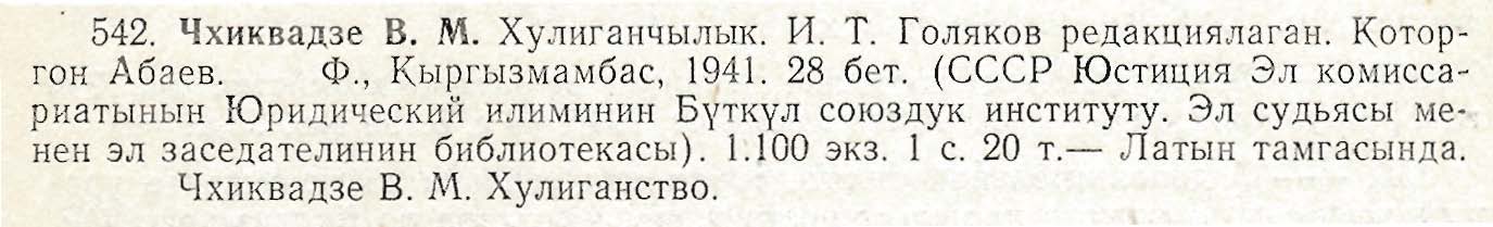 Entries are organized by subject in a manner similar to that used in the all-Union Knizhnaia letopis’ , as is common. In all but one of the volumes, Kyrgyz- and Russian-language entries are separated into their own self-contained sections. Russian-language books are described in Russian, Kyrgyz-language books are described in Kyrgyz (with a Russian translation of the title provided), and books in other languages (e.g. Dungan) are cited entirely in Russian translation. Books published before the conversion of Kyrgyz to the Cyrillic alphabet around 1941 are cited in Cyrillic, with a note that the original publication was in the Latin or Arabic script (see sample entry below). Dungan-language books published in Kyrgyzstan are reportedly indexed in all six parts, while books in Karachai-Balkar, Chechen, Ingush and German were only indexed in the volume for 1955-1959 (see the following entry for more information on works in these languages).