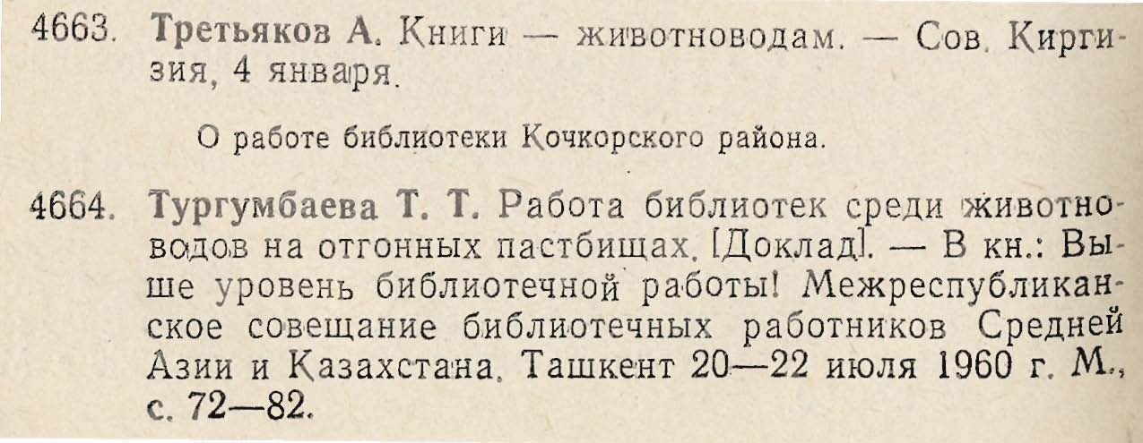 Each volume contains roughly 5,000 entries for Russian-language books, articles (from journals, newspapers and sborniki), and reviews published during the year indicated (i.e., 1961 or 1963). In addition to works devoted entirely to Kyrgyz-related topics, general works containing substantial information on Kyrgyzstan are also included. Entries are organized by subject, and indexes of personal and geographical names are provided. The 1961 volume also indexes musical and pictorial art publications, but, unlike the 1963 volume, does not index local publications (such as newspapers from smaller Kyrgyz cities). If the subject of a cited work is unclear from the title, a brief annotation is provided (see example above).