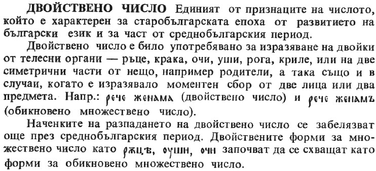 This small volume published by the Bulgarian Academy of Sciences is a dictionary of Bulgarian linguistic terminology. In fact, it is the first one of its kind to be compiled for Bulgarian. The bibliography opens with a brief overview of the historical development of linguistic vocabulary in Bulgarian including a discussion of earlier works that can be considered precursors to this dictionary. Terms are arranged alphabetically and appear in all capital letters and bold face. Most of the definitions are about several lines in length with some spanning up to two pages. A greatly expanded second edition of this dictionary was published in 1999 under the title Rechnik na lingvistichnite termini v bulgarskiia ezik, but the University of Illinois does not hold the volume. A list of sources appears at the end. See the definition below for the dual number.