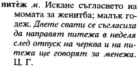 This dictionary of Bulgarian dialect forms is also an interim selection until a truly comprehensive Bulgarian dialect dictionary complete with full scholarly apparatus is produced. The entries are all signed with the initials of scholars who identified the forms or the writers who used them and they show part of speech, a definition in standard Bulgarian, and an example of usage. Unfortunately, they do not provide information about from what region or dialect the forms originate nor do they note the titles of the works from which the forms were extracted. Note the entry above left for the word “pitezh.”