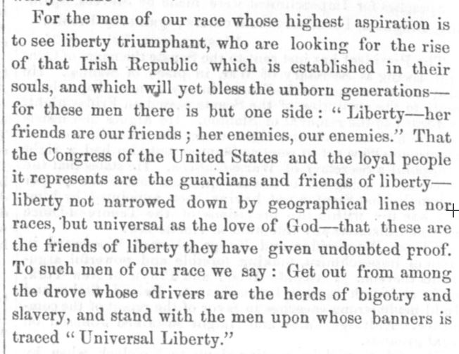 Fenianism in America was rife with factionalism–often quite volatile–that split along political, religious, and personal lines. In the first issue of the Irish Republic, the editors wrote, “we have met deadly (secret) opposition from many who ought to be our supporters, but who are not yet able to bear the light of truth and liberty,” a reference to the large number of Irish-Americans who supported the racist policies of the Democratic Party.