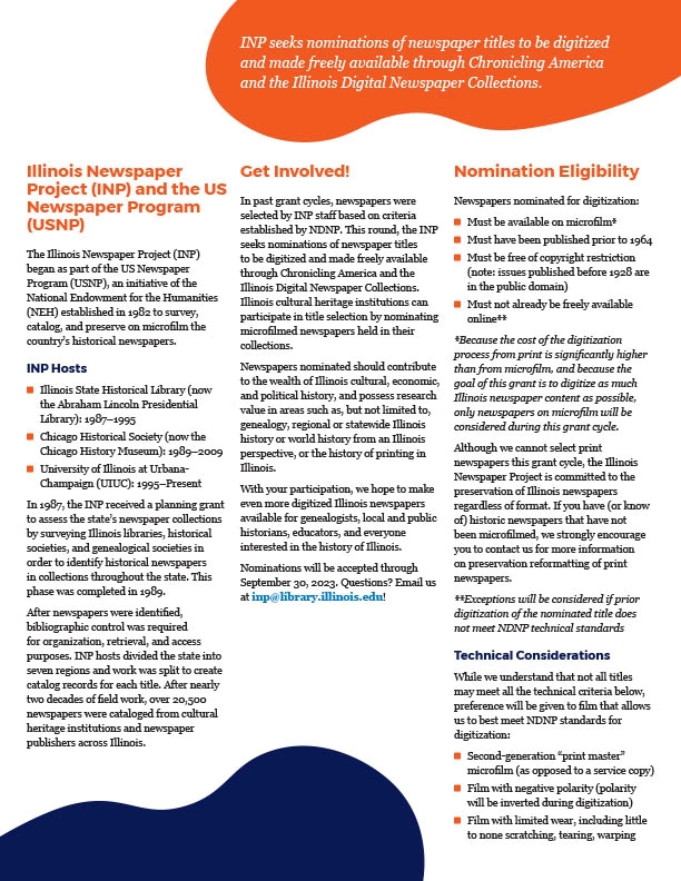 Check out the digital flyers to learn more about the history of the Illinois Newspaper Project (INP) and the National Digital Newspaper Program (NDNP). Also learn about the current opportunity to nominate newspapers for a chance to be made freely available online. Click on either image to open the full flyer PDF.